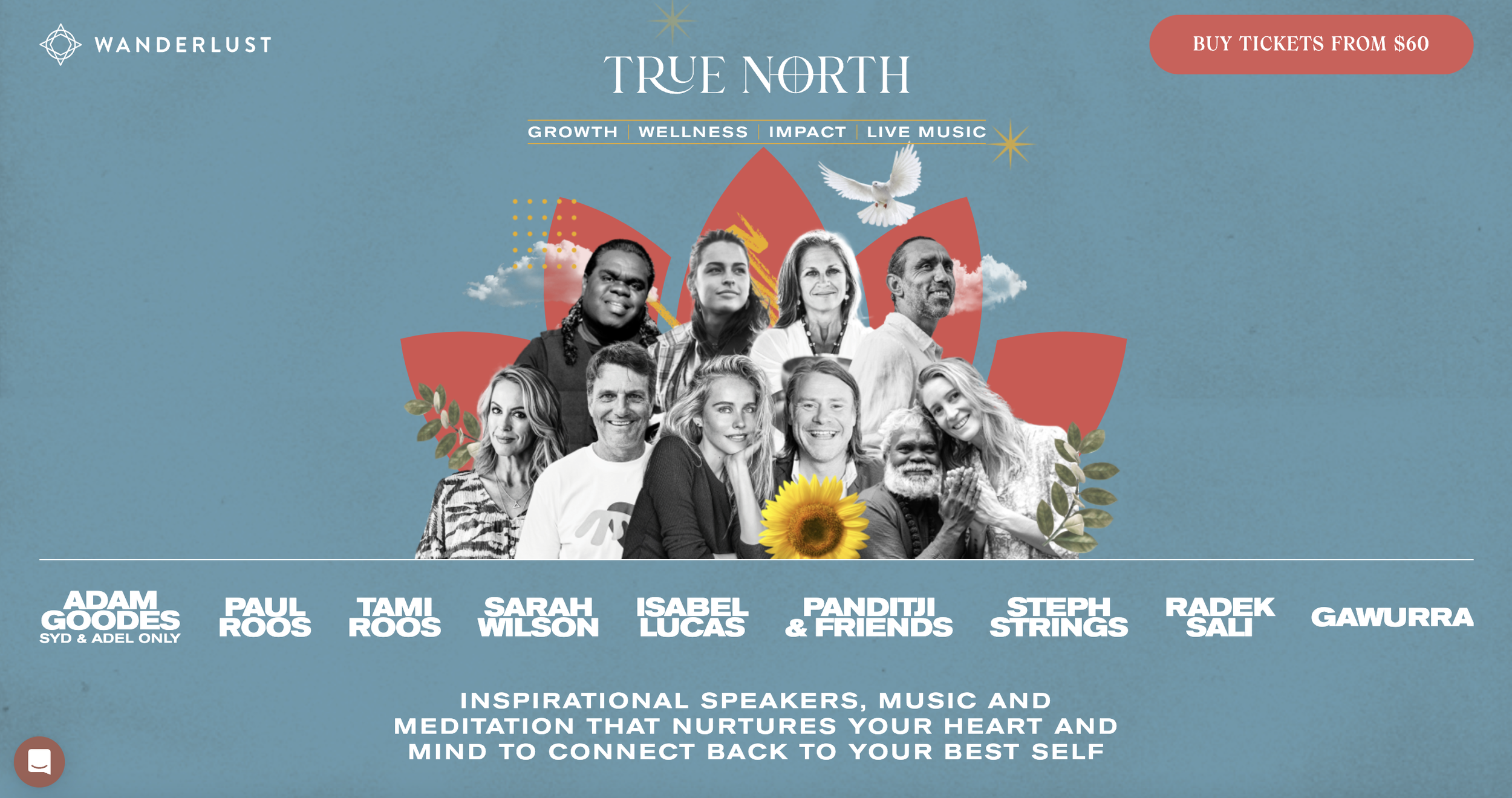 The Wanderlust events, MC'ed by Sarah Wilson, will include an opening ceremony and song by Gawurra, followed by an inspirational talk with Tami and Paul Roos. Panditji and Laura will then guide everyone into a deeply restful and enlivening mantra meditation accompanied by local musicians. After an interval for dinner and community connection, Isabel Lucas will be sharing a talk on environmental activism, followed by artist Steph Strings sharing music to close the evening in uplifting unity. Adam Goodes will also be joining for the Sydney and Adelaide events.